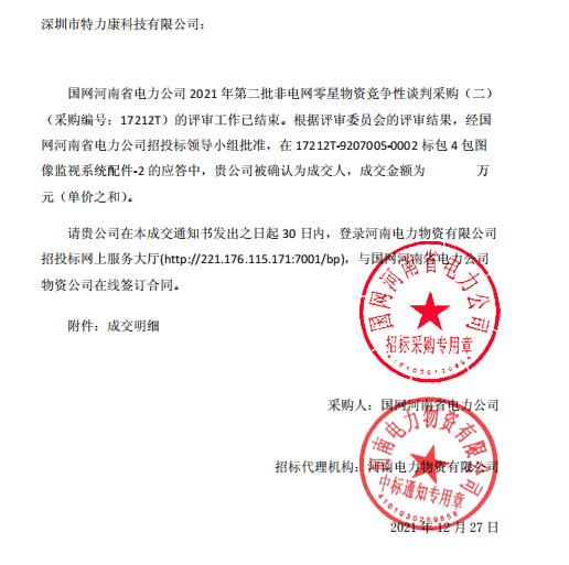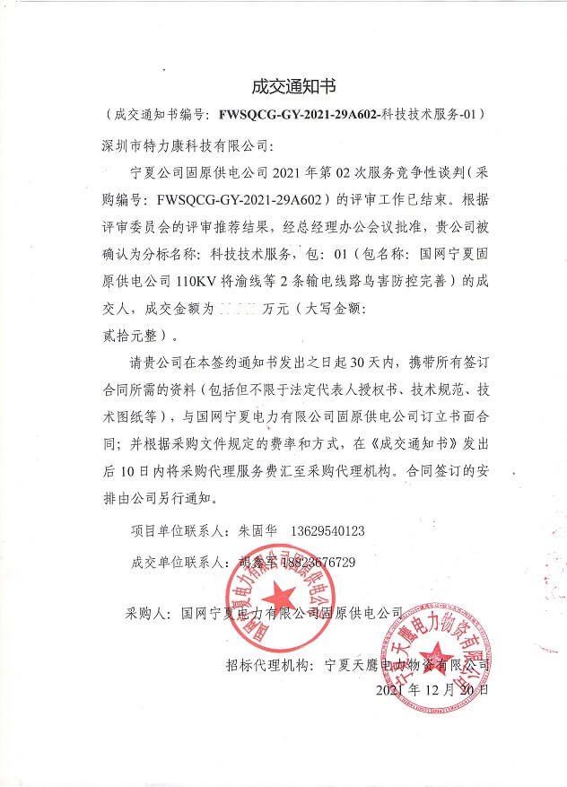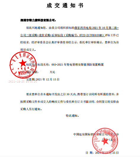 特力康中標國網黑龍江送變電工程公司的2024年度第18次物資類競爭性談判采購項目——慶陽驅鳥器物資框 特力康中標國網甘肅省電力公司省管產業單位2024年第五次物資競爭性談判授權采購項目 中標喜訊:深圳市特力康科技有限公司成功入圍許繼集團綜合能源公司輸電線路視頻在線監測裝置模塊集采項目 中標喜訊:特力康成功中標國網重慶市電力公司渝中一片區項目 特力康成功中標國網天津市電力公司2024年第二次?物?資招標項目 特力康中標國網安徽省電力有限公司蕪湖供電公司2024年3月非物質采購項目 四川電力用特力康架空輸電線路山火監測裝置,筑牢林區輸電 “防火墻”? 遼寧電力啟用特力康多視角監拍裝置,全維度守護輸電安全? 破解黃土高原沉降難題:山西電力用特力康北斗裝置守桿塔安全? 山東電力啟用特力康動態版智能激光驅鳥器,動態防控守護變電站安全? 湖南超高壓電力啟用特力康球機 AI 監測裝置,智能守護輸電通道安全? 廣西電力啟用特力康高壓電纜護層環流監控設備,筑牢電纜安全防線? 山東電力用上特力康綜合驅鳥器,多手段守護變電站安全? 陜西電力啟用特力康智能預警系統,多維監測守護輸電安全? 寧夏配電線路安裝了我司防外破電子化智能警示牌
