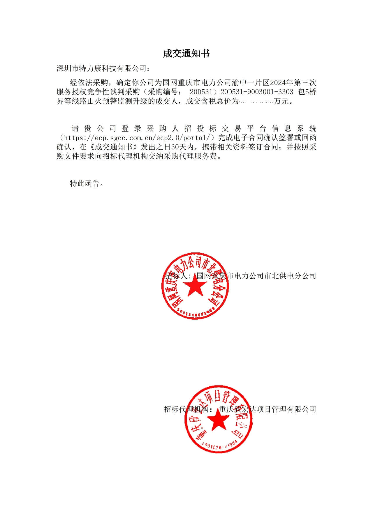 深圳,2024年4月26日——深圳市特力康科技有限公司(以下簡稱“特力康”)近日收到喜訊,經過嚴格的評審和競爭性談判,我司成功中標國網重慶市電力公司渝中一片區2024年第三次服務授權競爭性談判采購項目(采購編號:20D531)中的20D531-9003001-3303包5橋界等線路山火預警監測升級服務。